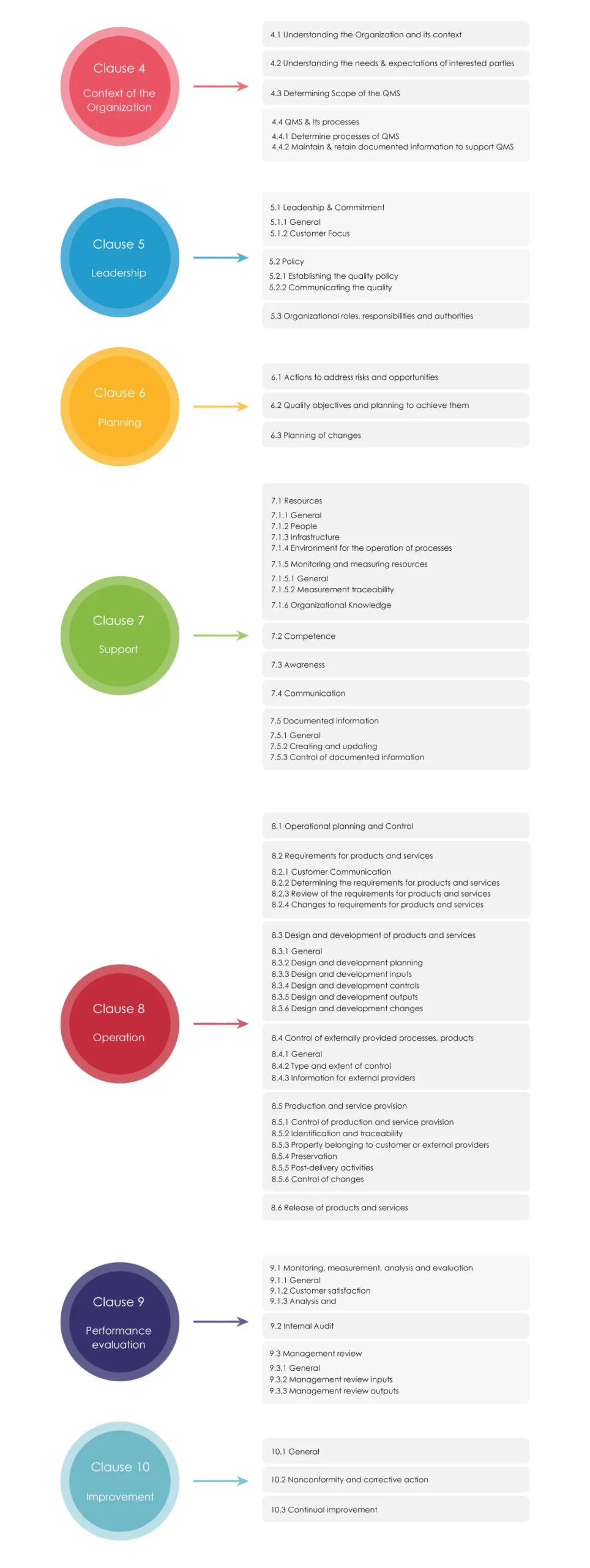 Its focus is on understanding the context of the organization, needs of the customer, maintaining documented information to support QMS. Leadership & commitment are pillars of this std. It imbibes the philosophy of “Do it right the First Time & Every Time” .